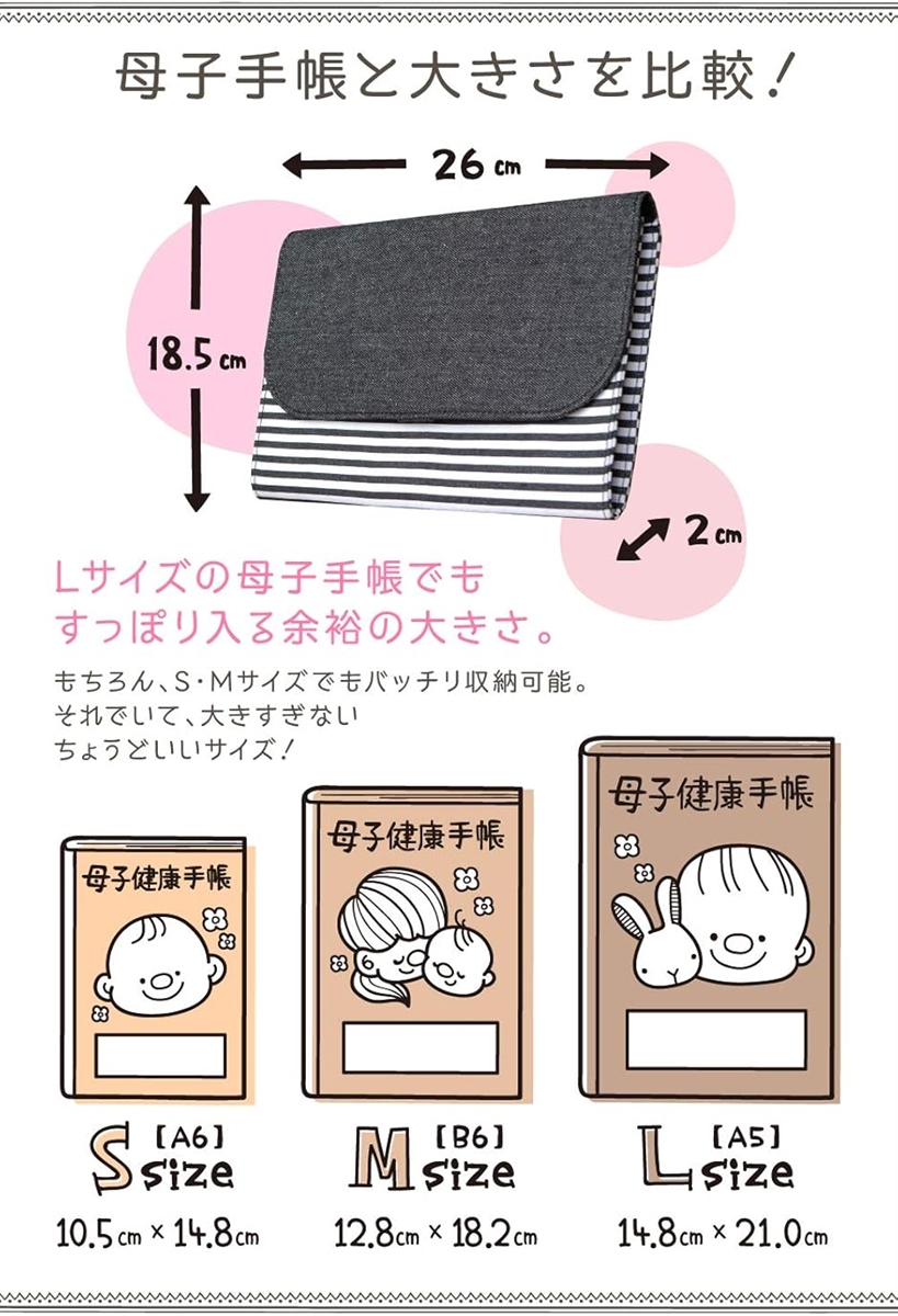 ・「 ちょうどいいサイズ 」Lサイズ(A5判)の母子手帳でもすっぽり入る大きめサイズ。