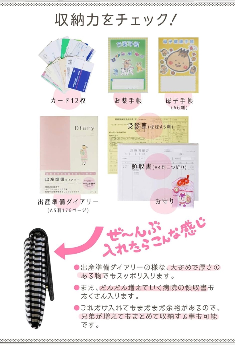 母子手帳の他にも、妊婦健診補助券やお薬手帳などを入れたり、産後にはお子様の診察券、乳児医療証、お薬手帳などを入れたり、何かと入れる物は増えていきます。