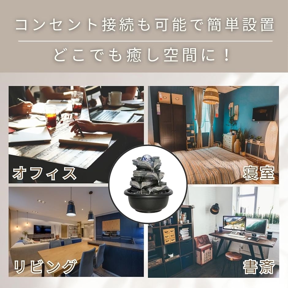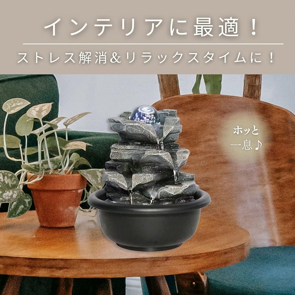 「卓上噴水で癒し インテリア」 この卓上噴水は、リラックス効果のある水の音で癒しの空間を演出します。