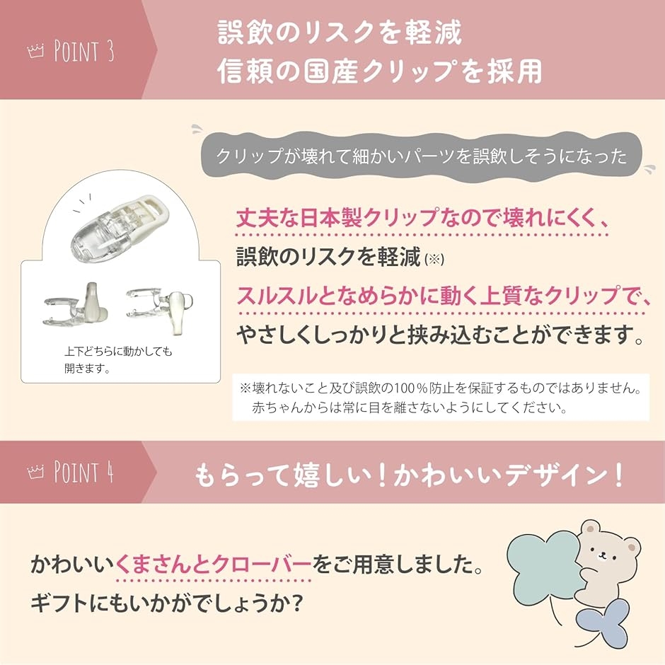 「誤飲リスクを軽減」丈夫な日本製クリップなので、壊れてパーツを誤飲するリスクを軽減できます。