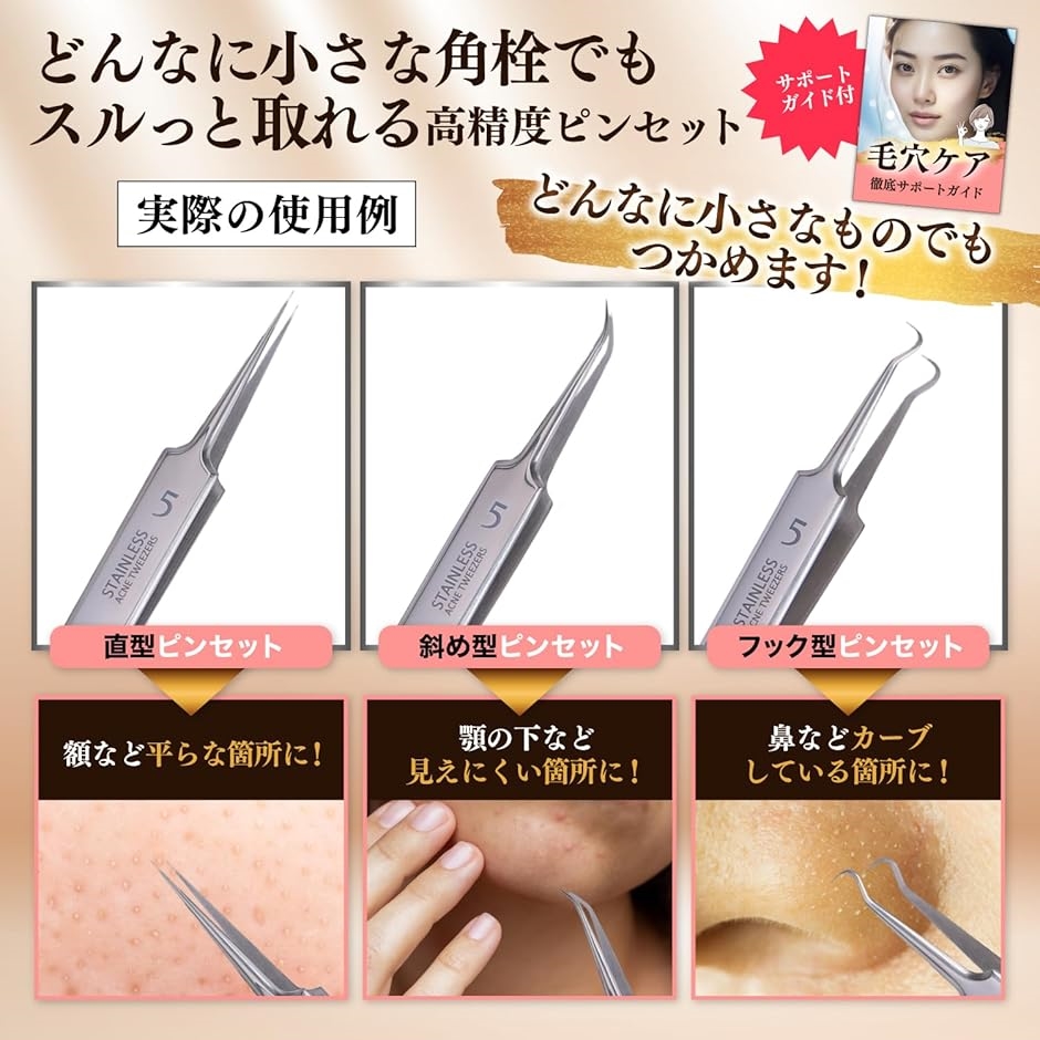 いちご鼻、黒ずみの原因、角栓やニキビの状態や用途に合わせて使用できる角栓取りピンセット。