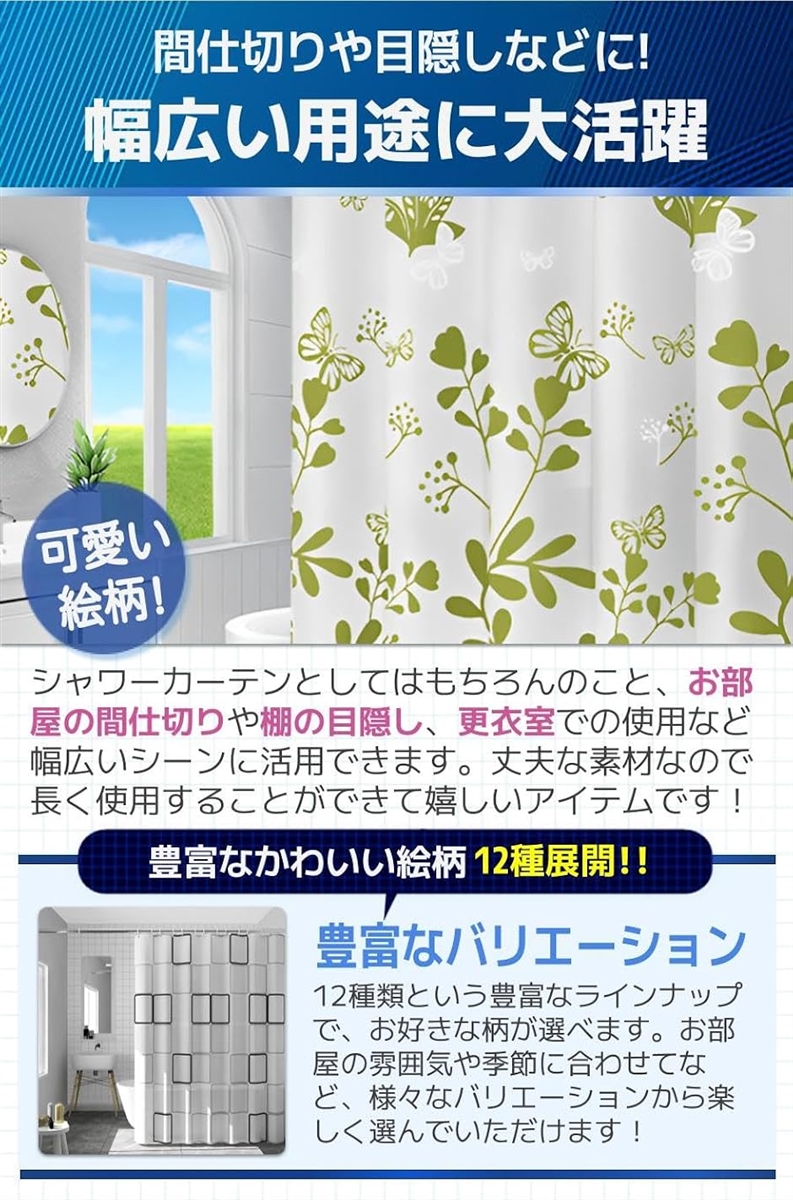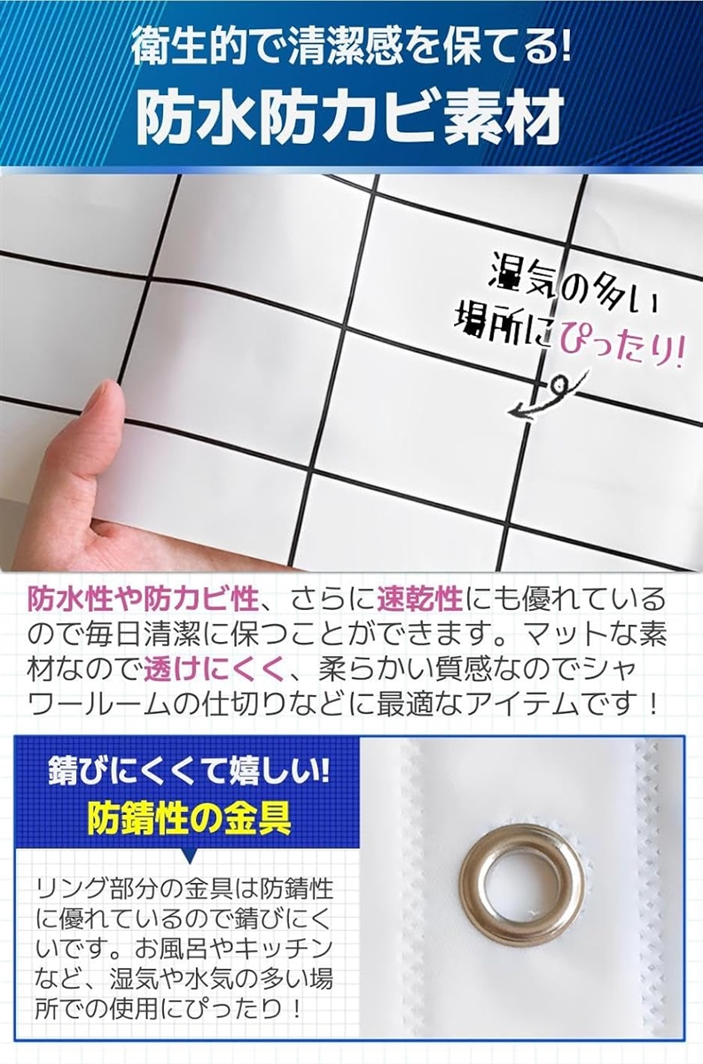 「幅広い用途に大活躍」シャワーカーテンとしてはもちろんのこと、お部屋の間仕切りや棚の目隠し、更衣室での使用など幅広いシーンに活用できます。