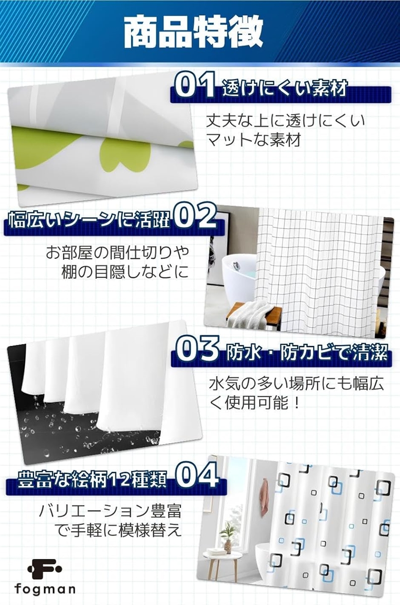 「商品特徴」(1)透けにくい素材:丈夫な上に透けにくいマットな素材/(2)幅広いシーンに活躍:お部屋の間仕切りや棚の目隠しなどに/(3)防水・防カビで清潔:水気の多い場所にも幅広く使用可能。/(4)豊富な絵柄12種類:バリエーション豊富で手軽に模様替え