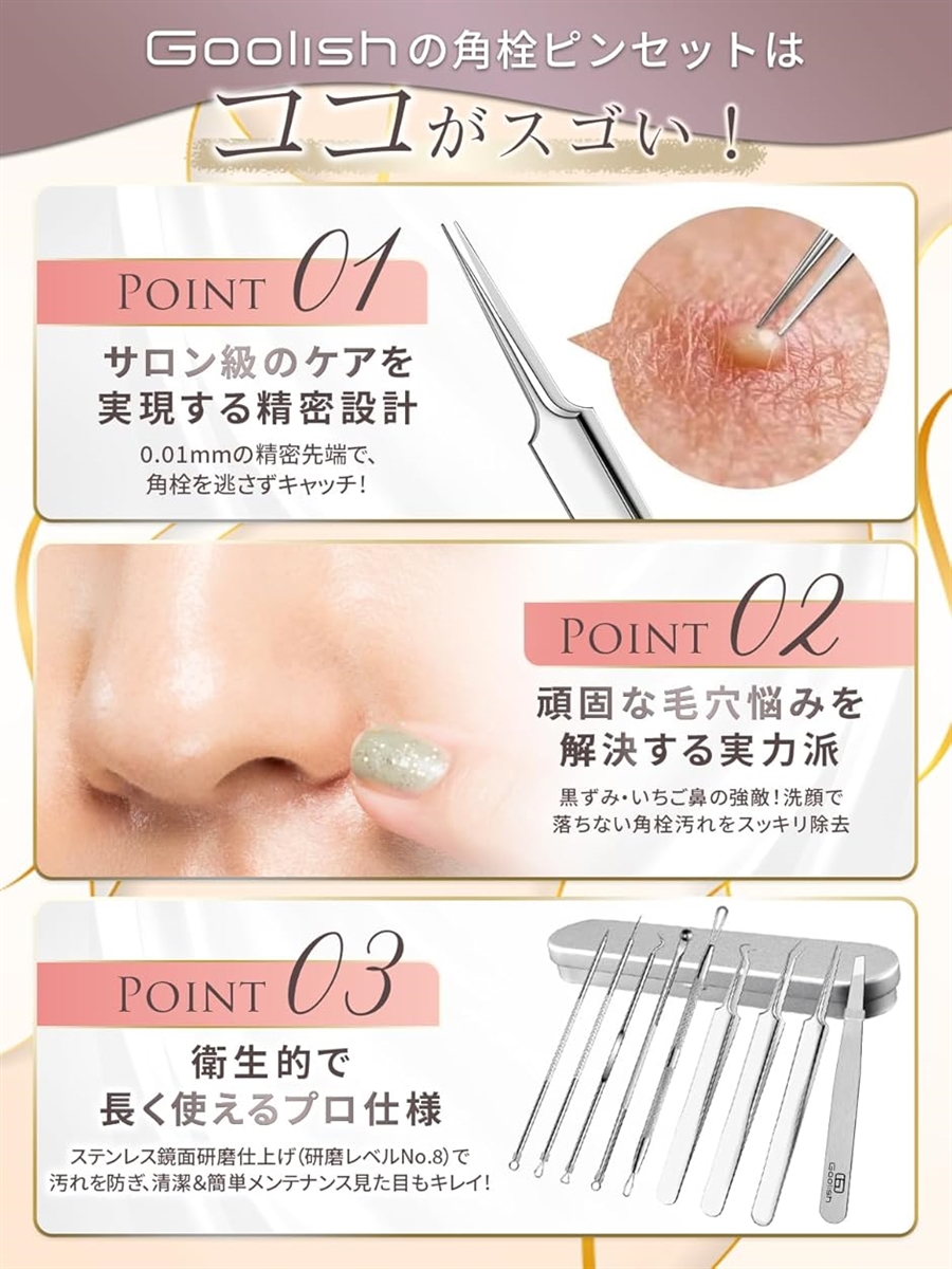 ビューティープロフェッショナル監修の角栓ケアセット:角栓除去や毛穴の角栓取りをはじめ、トゲ抜きや角質取り、うぶげとり、ニキビ潰し、稗 粒 腫や膿 栓の除去、さらにはまつ毛ピンセットとしても使用可能な多機能ツールを揃えたセットです。