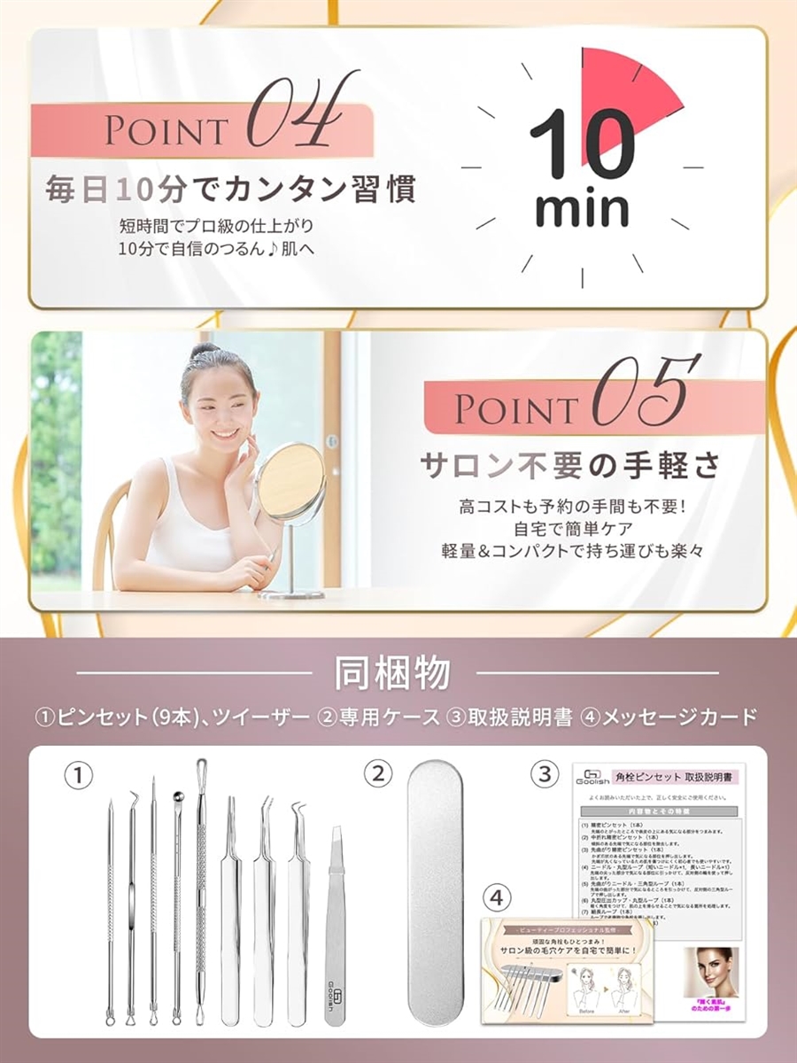 充実の9点セット:角栓取りピンセット、極細針、まつ毛ピンセット、先丸ピンセットを含むセットに加え、取扱説明書も同梱・