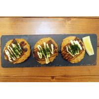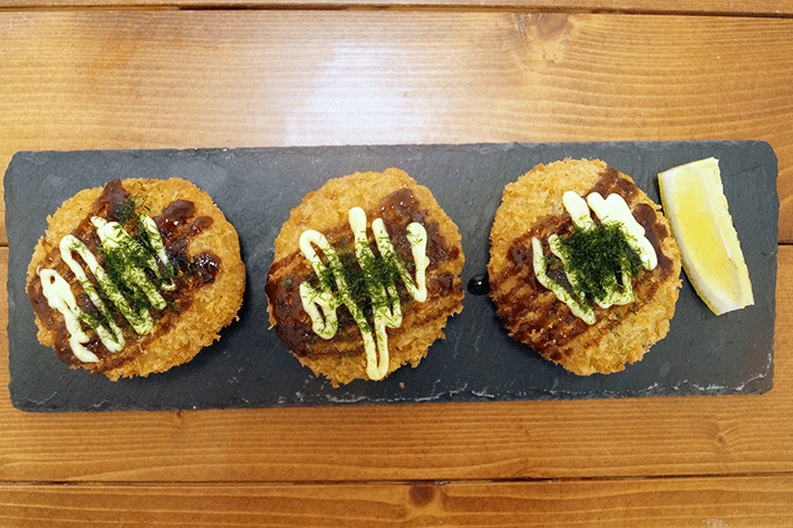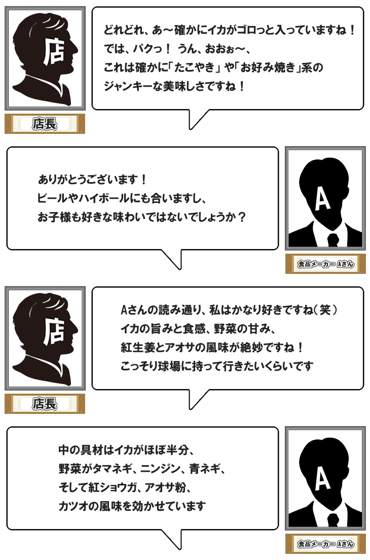 原材料名:いか(ペルー又はチリ)、野菜(たまねぎ、にんじん、青ねぎ)、つなぎ(でん粉、小麦粉)、紅しょうが、植物油脂、しょうゆ、砂糖、食塩、あおさ粉、かつお風味量、衣(パン粉、でん粉、小麦粉、植物油脂、粉あめ、食塩) / 加工でん粉、調味料(アミノ酸等)、増粘剤、(加工でん粉、増粘多糖類)、pH調整剤、膨張剤、酸味料、ベニコウジ色素、(一部に小麦・乳成分・大豆・いかを含む)