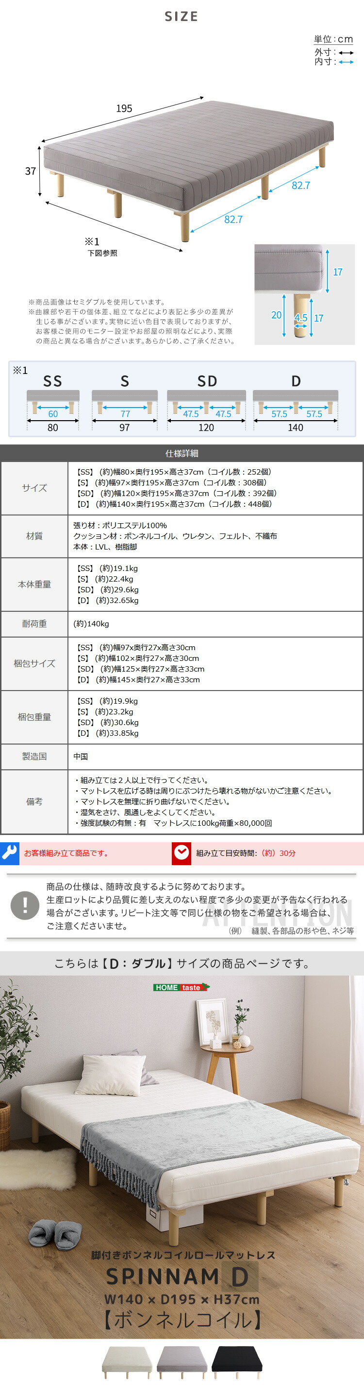 >>脚付きボンネルコイルロールマットレス【SPINNAM-スピンナム-】 Sサイズはこちら