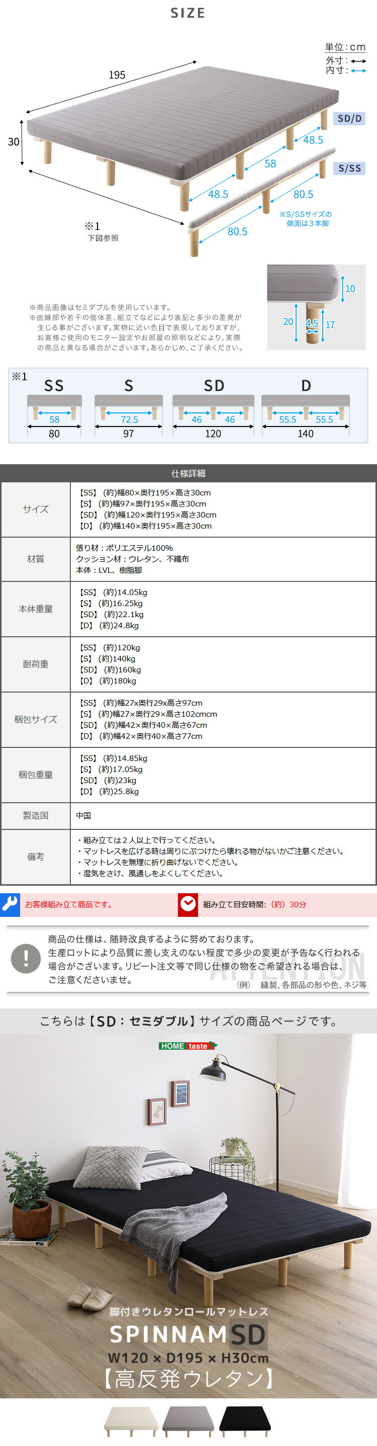 >>脚付きウレタンロールマットレス【SPINNAM-スピンナム-】 SSサイズはこちら
