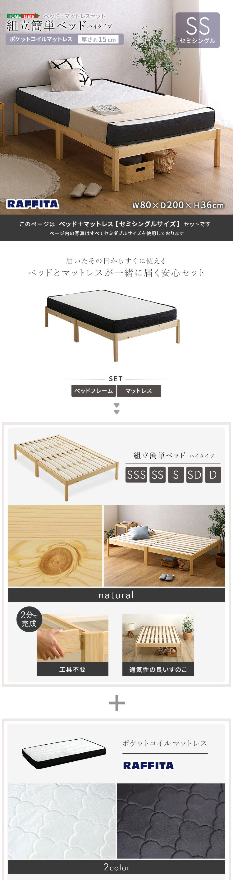 2分で完成!組立簡単ベッド ハイタイプ ポケットコイルマットレスセット(セミシングル)