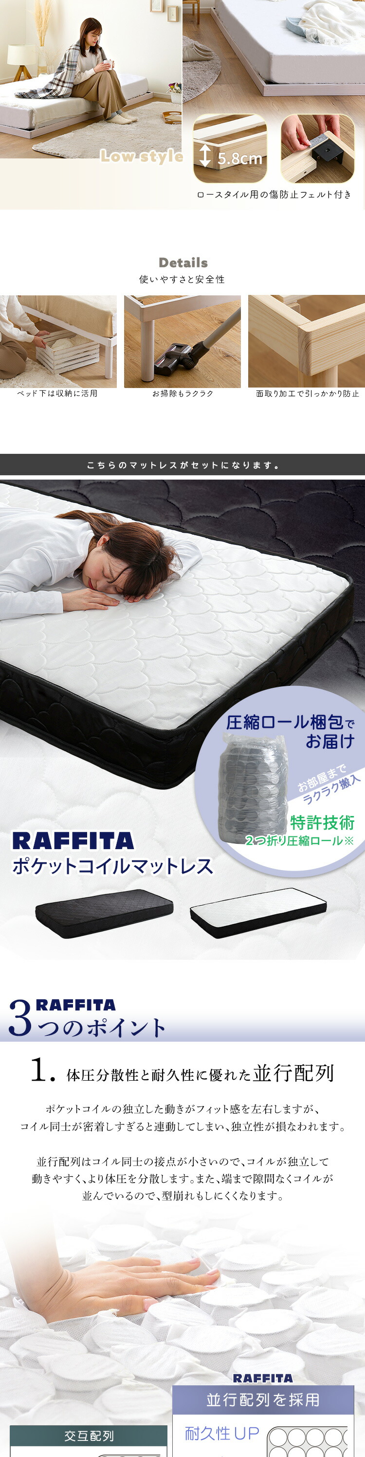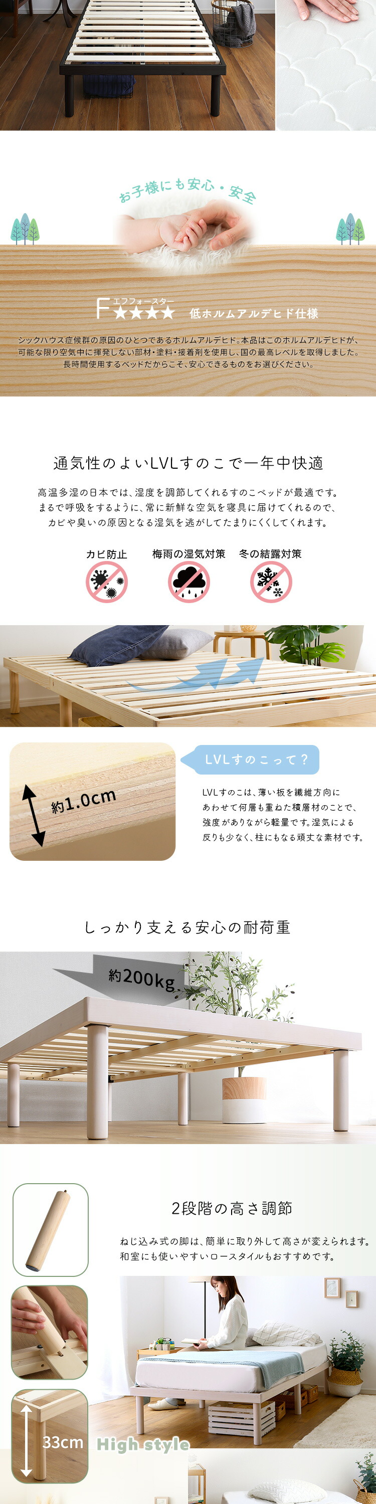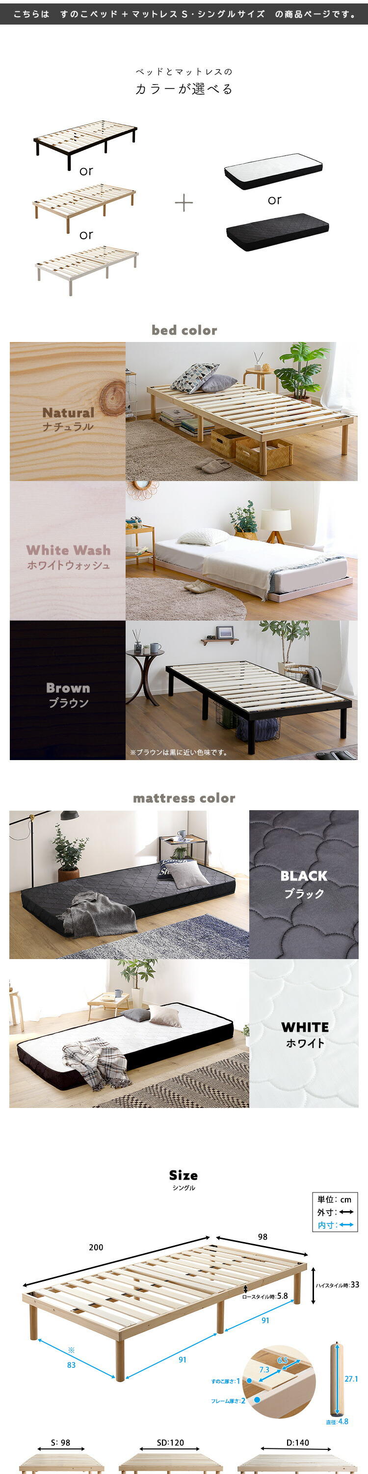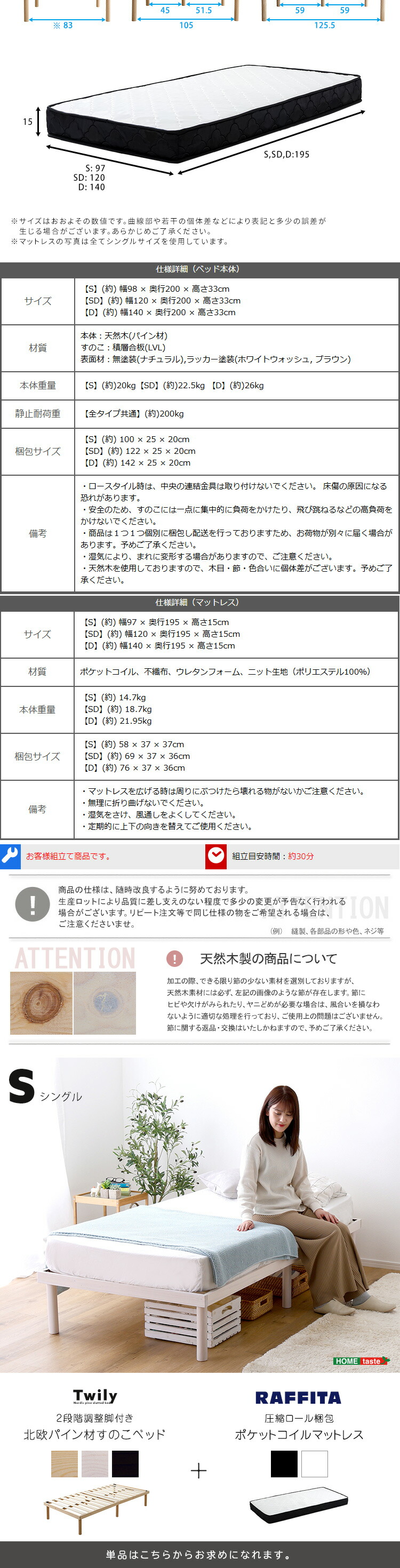 パイン材高さ2段階調整脚付きすのこベッド ポケットコイルマットレスセット(シングル)