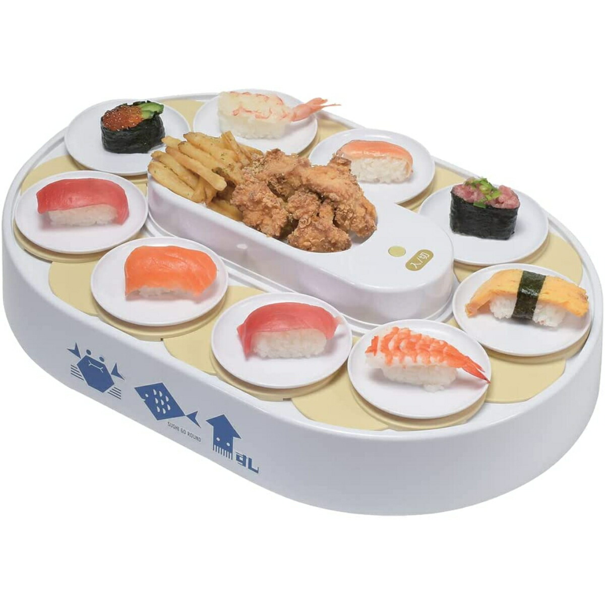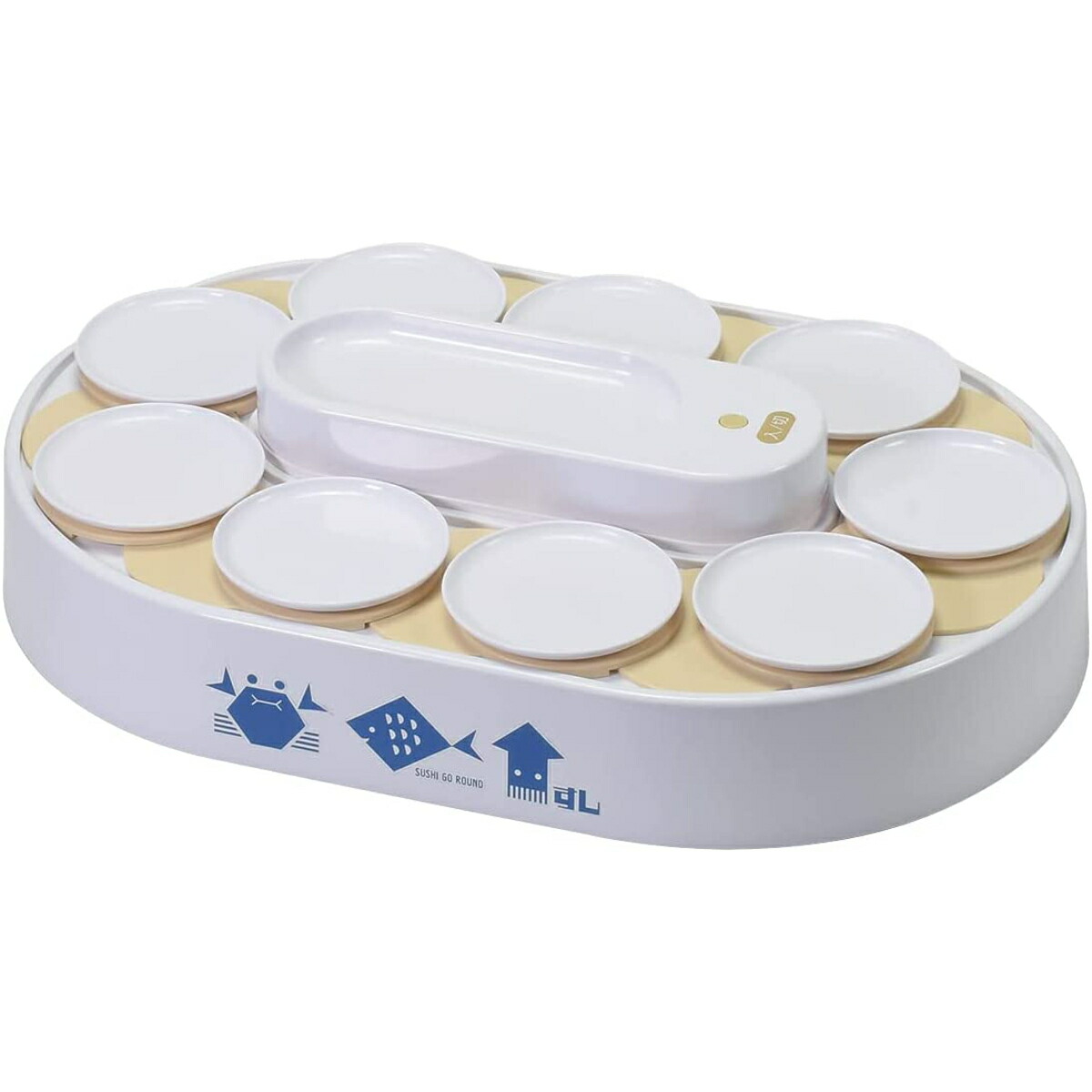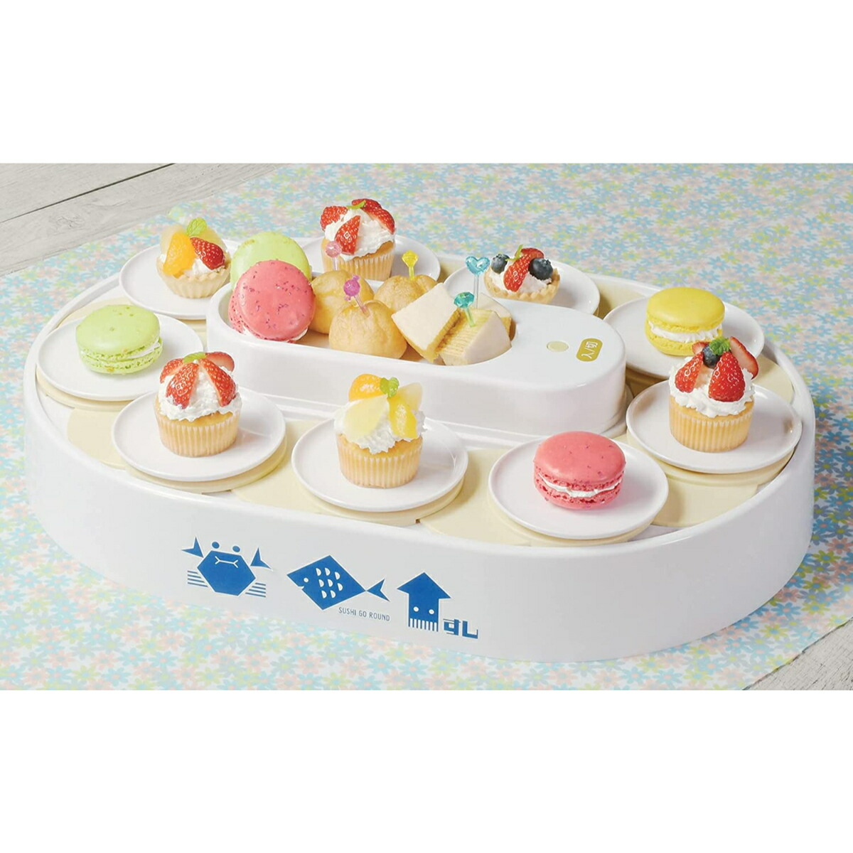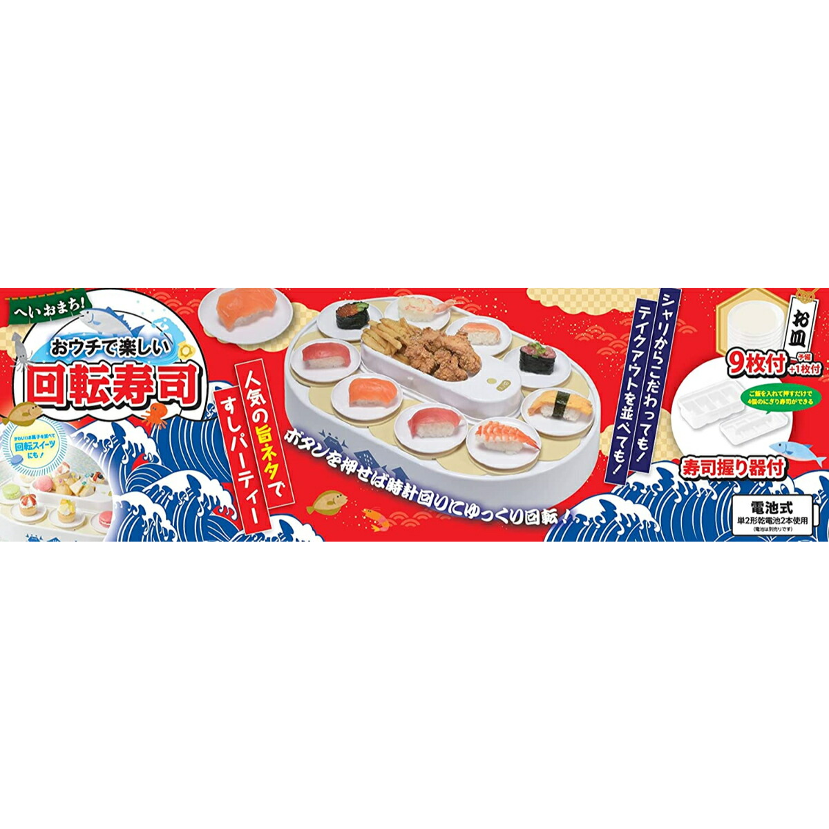 | へいおまち!おウチで寿司パーティーができる回転寿司! 人気の旨ネタで寿司パーティーを。自宅で簡単に回転寿司が楽しめます。 ボタンを押すとレーンがゆっくり回転!シャリからこだわってもよし、テイクアウトを並べてもよしです。 ご飯を入れて押すだけで4個のにぎり寿司ができる寿司握り器付きです。 かわいいお菓子を並べて回転スイーツも! 《付属品》 ・お皿9枚+予備1枚 ・寿司握り器 《シリーズ対応品》 ・D-6764 おウチで楽しい 回転寿司用お皿5枚組 ・D-6769 おウチで楽しい 握り寿司の型 ・D-6770 おウチで楽しい 細巻き寿司の型 ・D-6771 おウチで楽しい いなり寿司の型 ご注意:食器洗い乾燥機等には使用しないでください。 レーンは取り外しできません。隙間に汚れや異物が入り込むと、故障やカビの原因になります。使用中に水分や食品がこぼれないよう、十分注意して使用してください。 重量(g):1700 耐熱温度:- 耐冷温度:- 材 質:本体・寿司皿:ABS樹脂(耐熱温度80度) 握り寿司型:ポリプロピレン(耐熱温度100度) その他:- 原産国:中国 | |