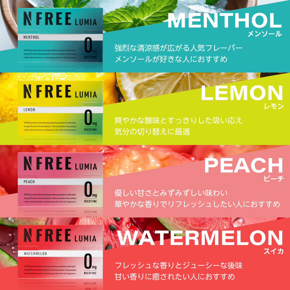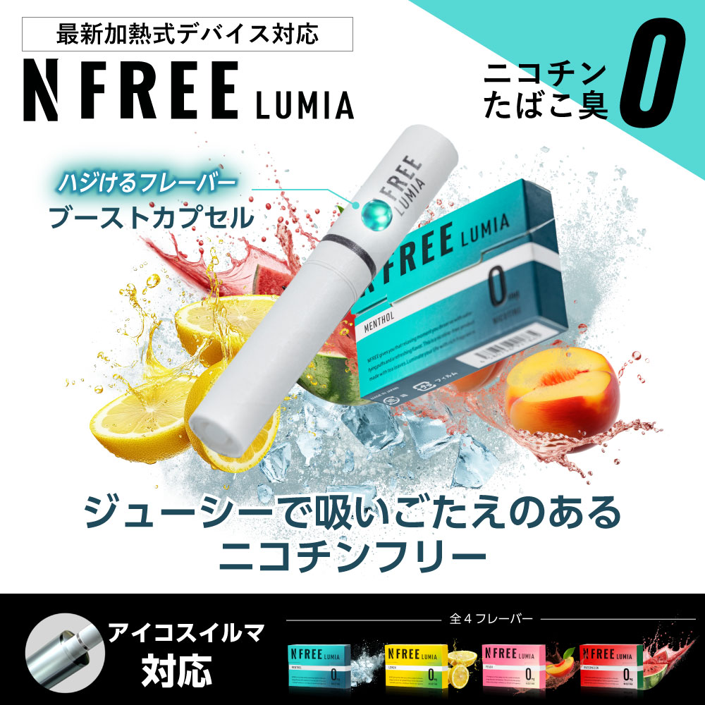 ![]() | ⇒【1カートン(10箱セット)】NFREE LUMIA(エヌフリー ルミア)茶葉スティックはコチラ 加熱式たばこデバイス用ノンニコチン茶葉スティックが誘導加熱式デバイスで喫煙できるようになり、「ニコチンレスは物足りない!」のお声に応えるためにフレーバーカプセルを搭載して新発売! |