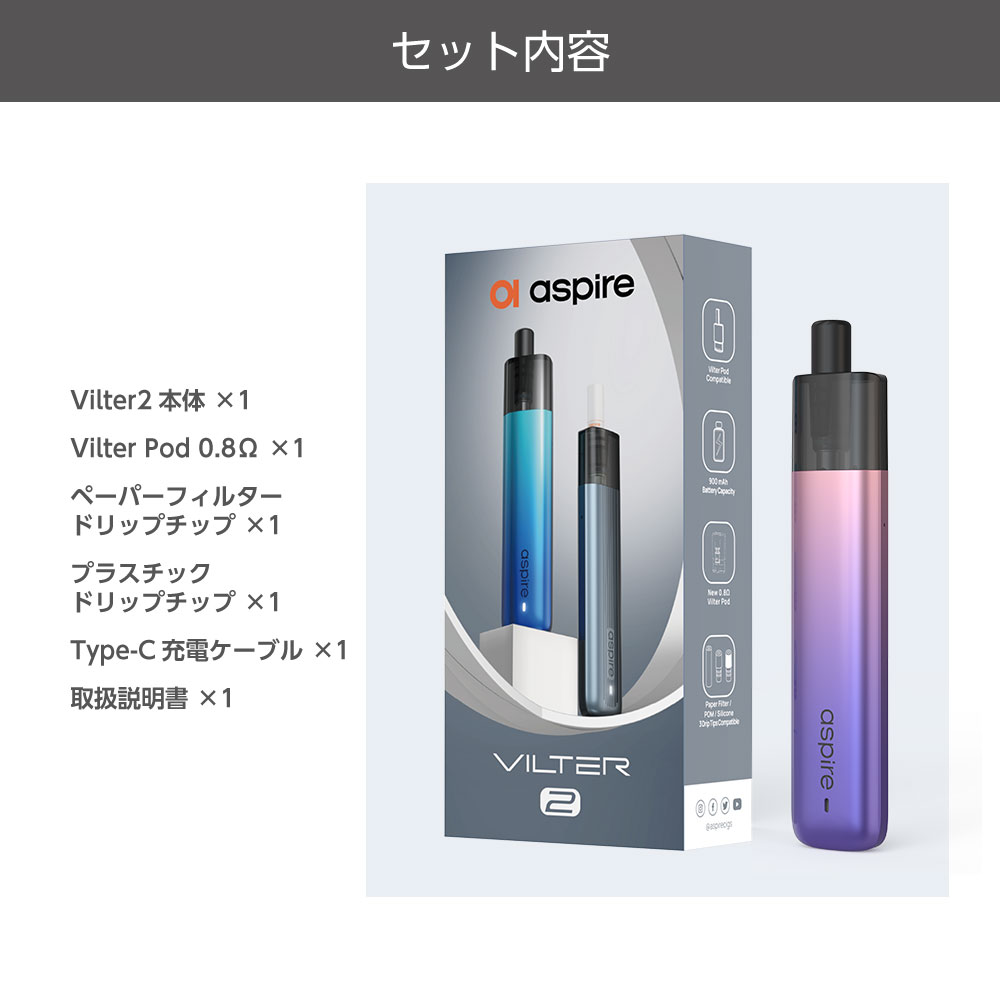 | ⇒Aspire VILTER 2 (アスパイア ヴィルター 2 )スターターキットはコチラ 交換用PODカートリッジ2個と選べるリキッドが3本付いた、すぐに始められるスターターセット! |