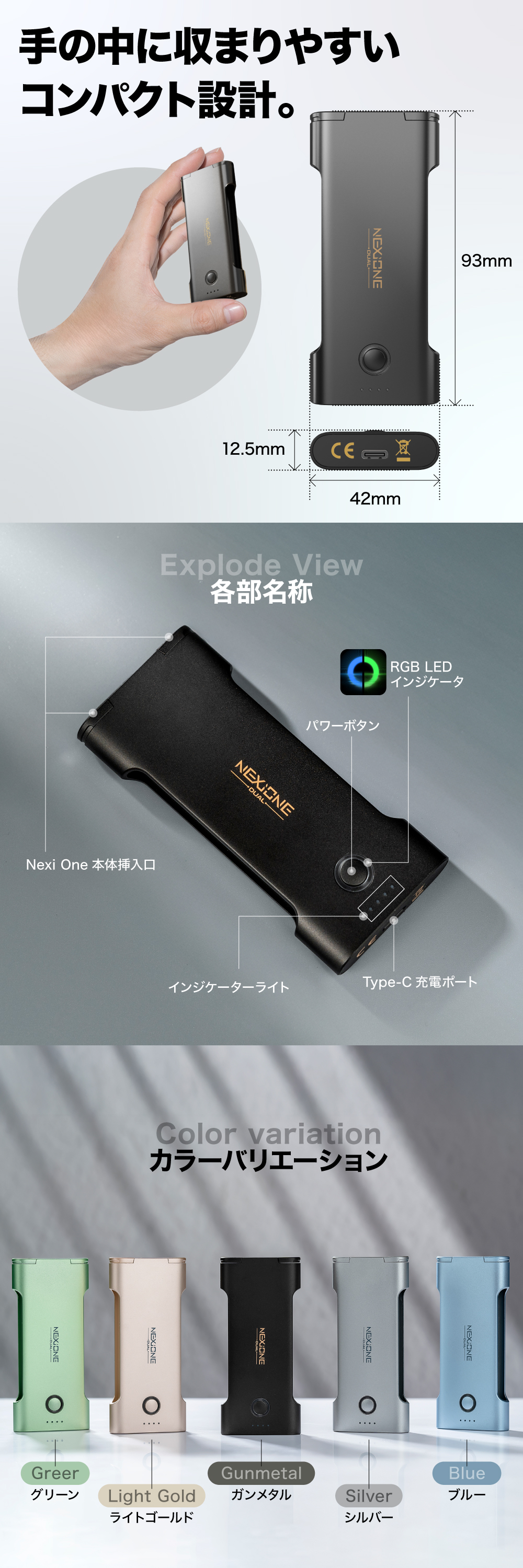 1000mAhの大容量バッテリーを搭載し、NEXI One本体(400mAh)をしっかりサポート。