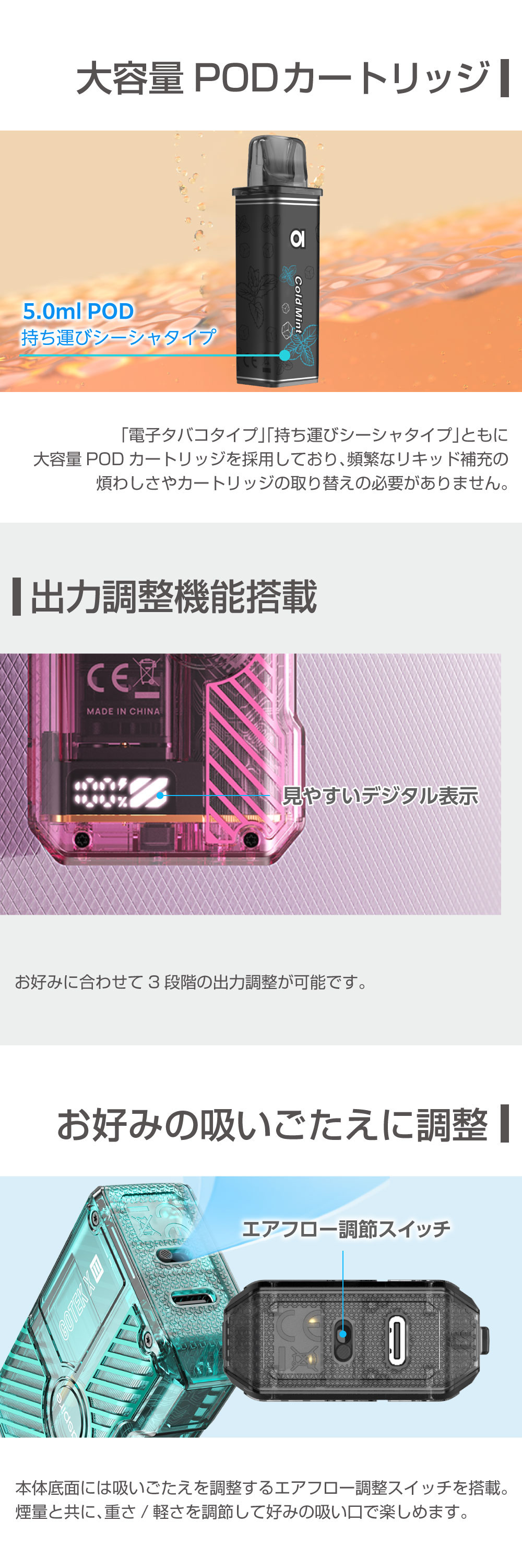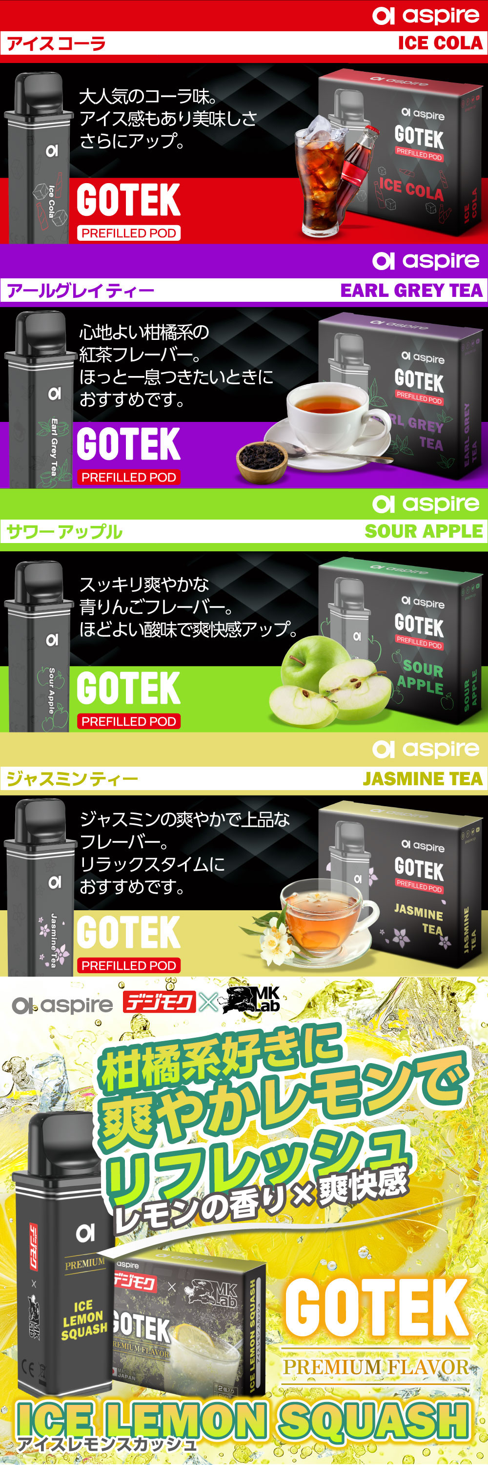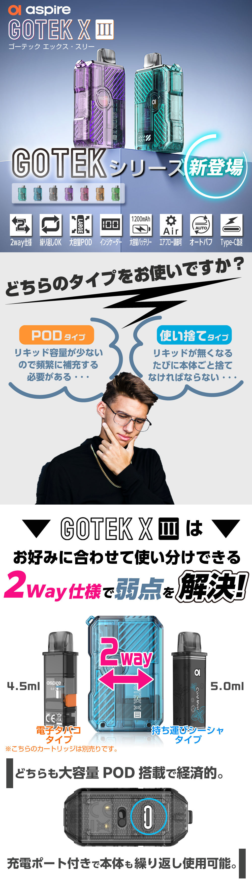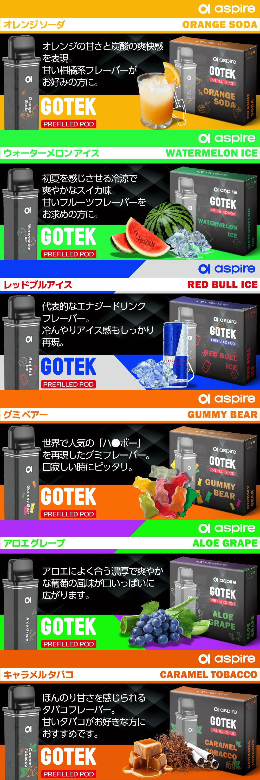 ![]() | ⇒Aspire GOTEK X3(アスパイア ゴーテック エックス3) スターターキットはコチラ 遂に登場!交換用PODカートリッジ2個と選べるリキッドが1本付いた、すぐに始められるスターターキット。 |