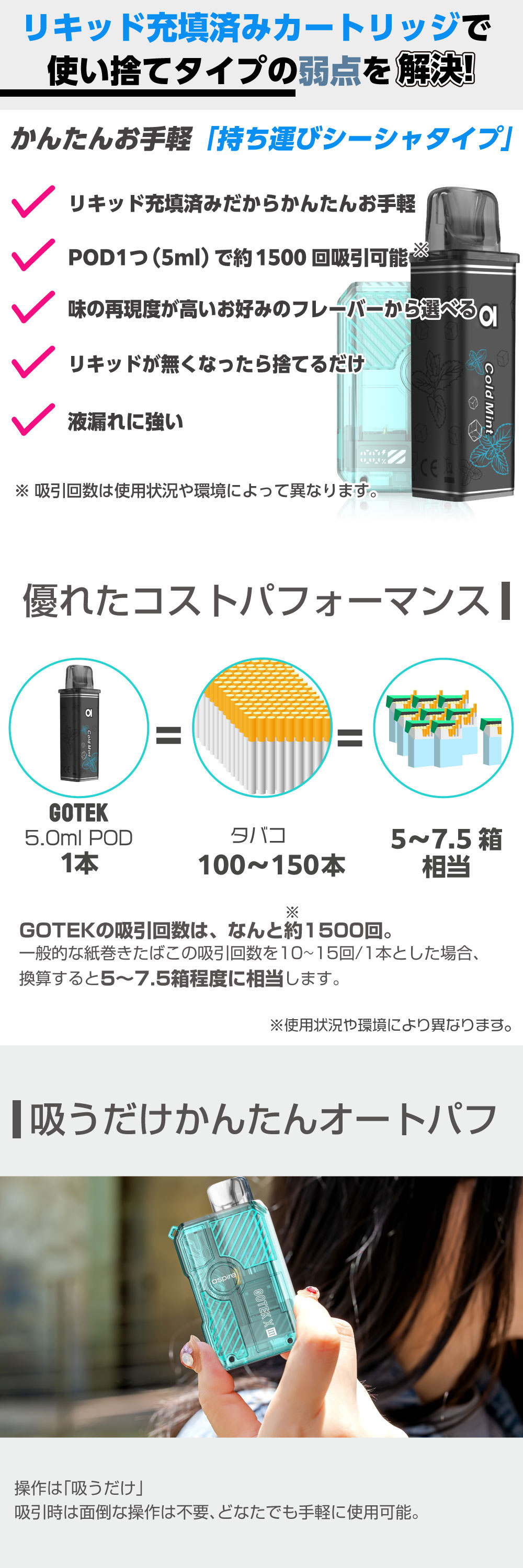 ![]() | ⇒持ち運びシーシャ タイプのカートリッジ(4本セット)はコチラ かんたんお手軽!Aspire GOTEK (アスパイア ゴーテック)シリーズの持ち運びシーシャタイプのカートリッジ。 |