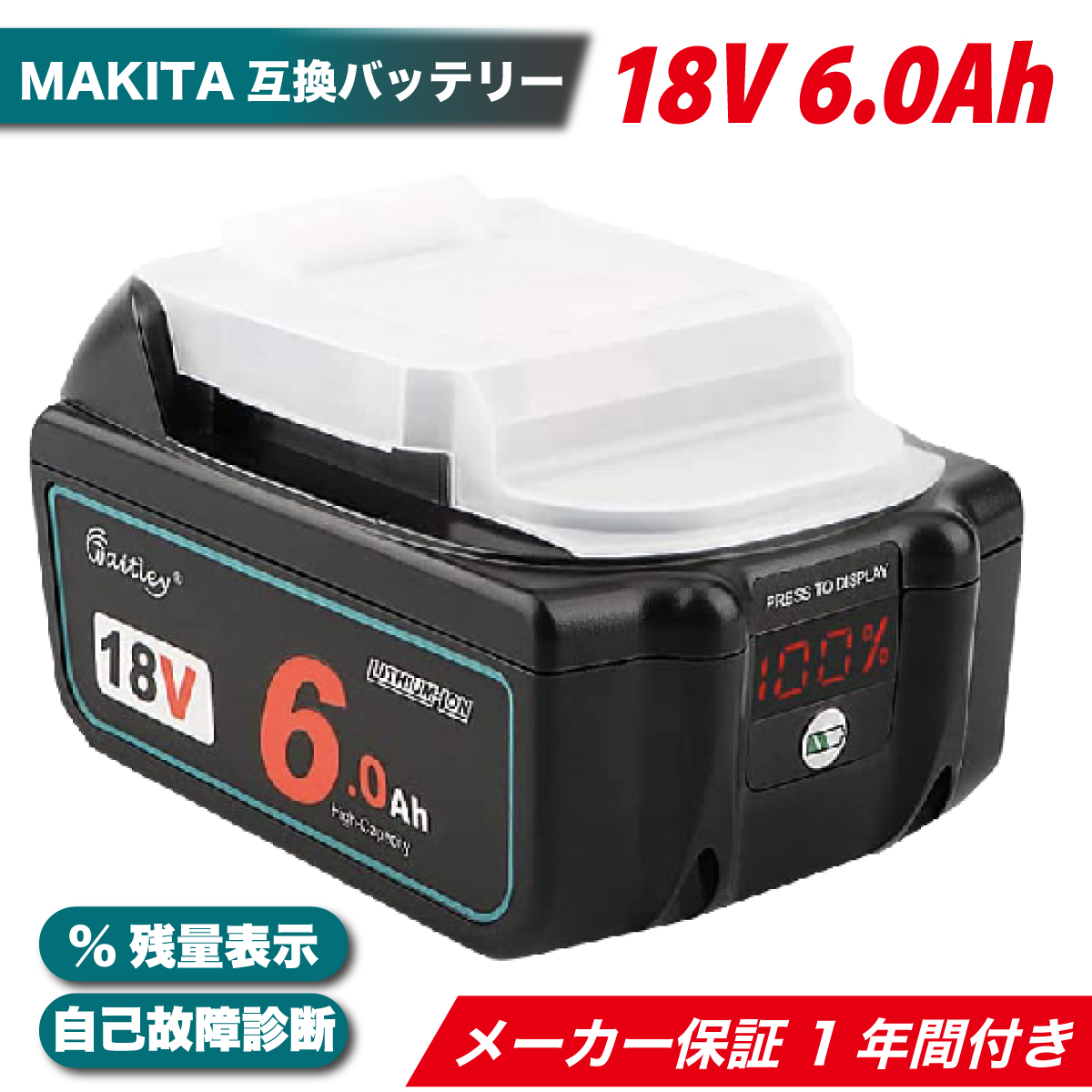 マキタ 互換 バッテリー 18V 6.0Ah Waitley【商品説明】視認性の高いパーセンテージでの充電残量表示機能と自己故障診断機能を搭載したWaitley社製のMAKITA互換バッテリーです。マキタ純正の電動工具はもちろん、草刈機、掃除機、集塵機、ブロアー、空気入れなど18Vの機種には全て対応しており、問題なくご使用いただけます。