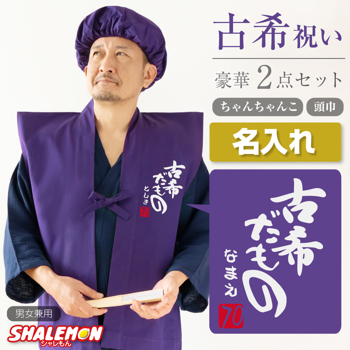 シャレもんオリジナル古希祝い用ちゃんちゃんこ頭巾セットです。
