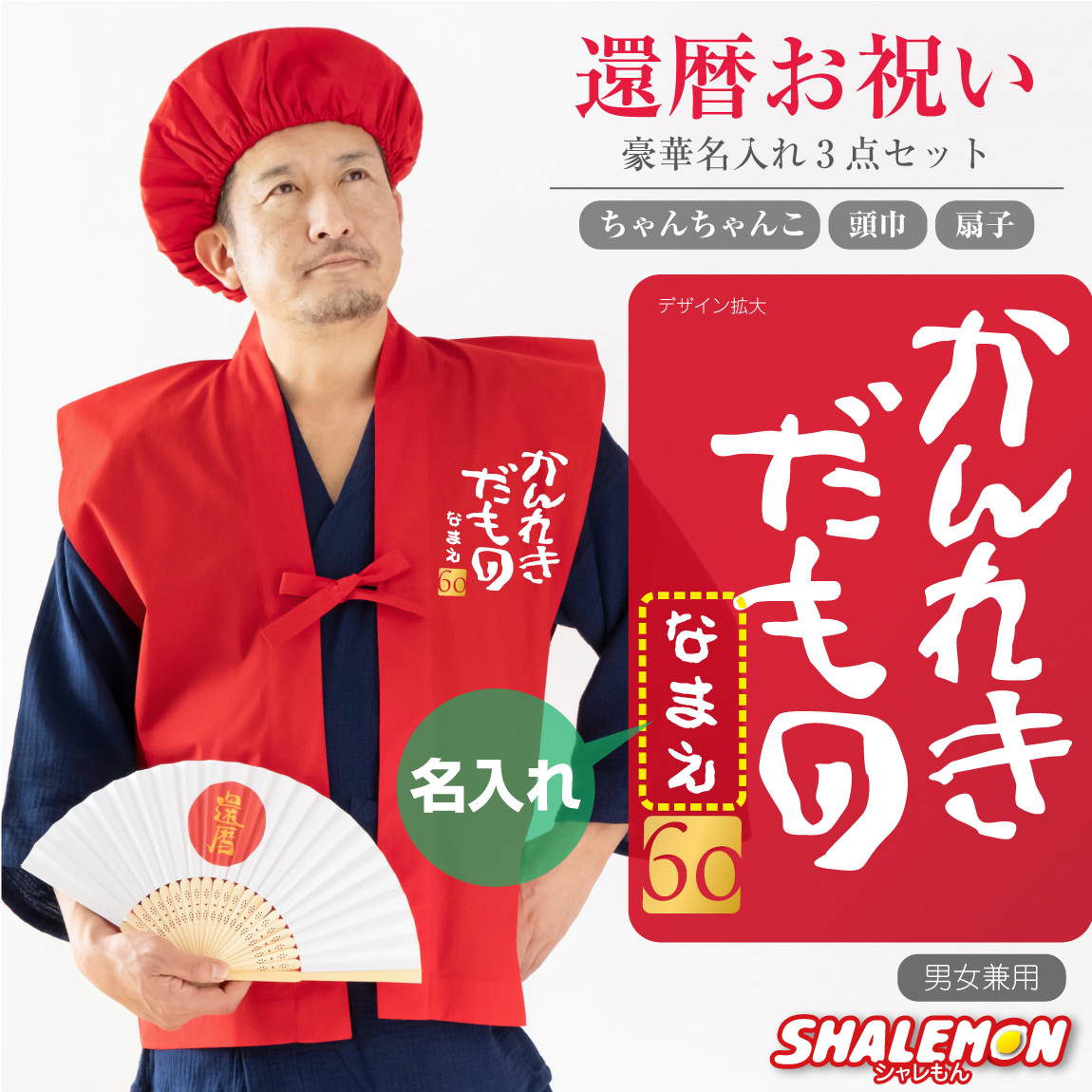 還暦 ちゃんちゃんこ 還暦祝い 父 母 プレゼント【 かんれきだもの 名入れ 赤いちゃんちゃんこ 頭巾 扇子 3点セット 】【 金落款60 】【 還暦扇子 】