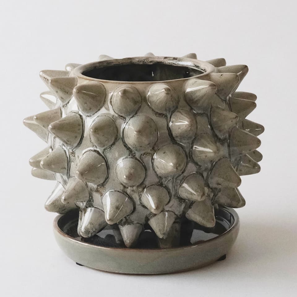 ソルトゲ【グレー】 Φ18cm×14cm 植木鉢 受け皿付 5号 陶器 棘 球形 ボール 丸 ホワイト 白 アガベ コーデックス サボテン ビザールプランツ ヴィンテージ 無骨