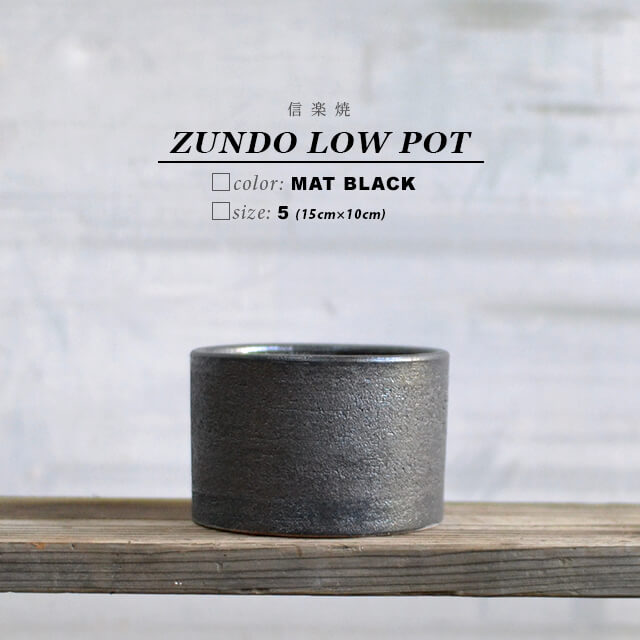 KAMIYAMA ZUNDO LOW POT【ブラック 5号LOW】15cm×10cm かみ山陶器 植木鉢 寸胴 ロー 信楽焼 浅鉢 底穴大きい おしゃれ かっこいい アガベ コーデックス