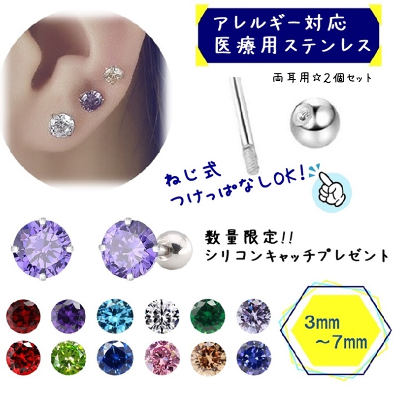 アレルギー対応の316Lサージカルステンレス製つけっぱなしピアス。誕生石キュービックジルコニア両耳2個セット。ねじ式&シリコンキャッチ付。ギフトは別売りボックスで。