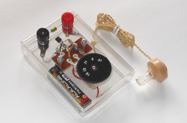 トランジスタ1個で検波と増幅をしてしまう、二乗検波方式の簡単な1石トランジスタラジオキットと穴あけ加工済ケースのセットです。