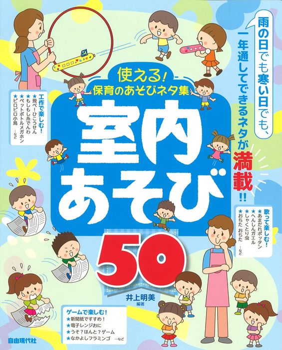室内でできるあそびを、工作・ゲーム・歌に分けて50項目掲載。外で遊べない時に使える、用意も少なく簡単にできるあそびを中心に厳選。