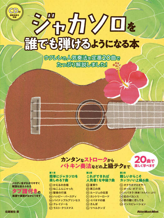 ●Introduction ウクレレとジャカソロの基礎知識/01 ジャカソロとは?/02 ウクレレの各部名称/03 構え方/04 チューニング/05 音符と拍子/06 楽譜とコード・ダイアグラム/07 楽譜の進行/08 楽譜の進行/09 弦の押さえ方/10 右手の記号/11 ジャカソロの種類/●第1章 簡単にジャカソロを楽しめる7曲/1-01 ジャカソロを体験!/「かえるの合唱」/1-02 親指ピッキングを加えたアプローチ/「ねこふんじゃった」/1-03 アップ・ストロークでさらにジャカジャカ/「聖者の行進」/1-04 シャッフルのリズムで盛り上げましょう/「ハッピー・バースディ」/1-05 同じコードでメロディだけ動かすテクニック/「パイナップル・プリンセス」/1-06 空ストロークでリズムをキープ!/「クレイジーG」/1-07 「セーハ」でコードを押さえます/「ラスト・クリスマス」/●第2章 これができれば人気者!な中級7曲/2-01 16ビートの細かいストロークを習得/「夏祭り」/2-02 1弦をミュートするとメロディが際立ちます/「第三…/【出版社:リットーミュージック】