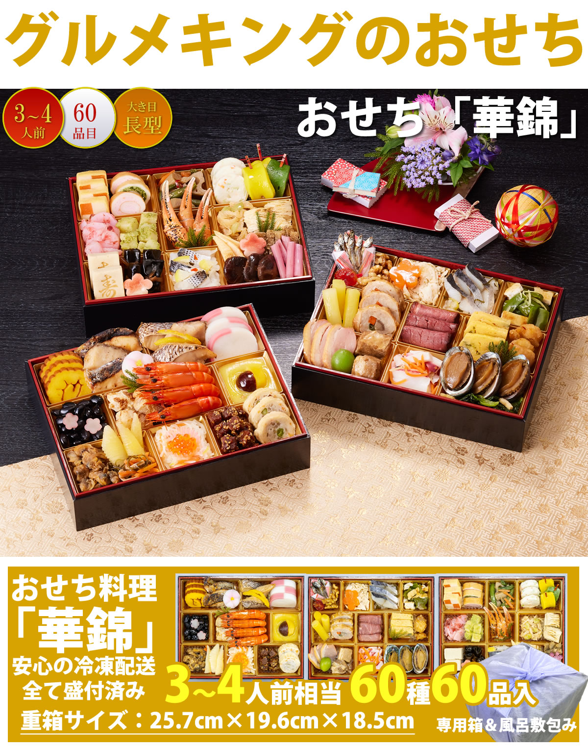 京都しょうざん和風おせち料理「華錦」三段重3〜4人前(60種60品)