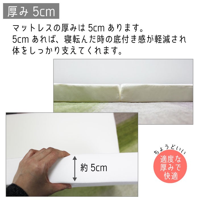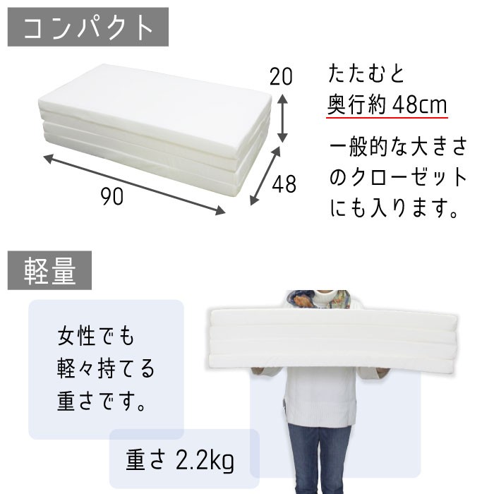 敷き布団の下やベッドマットレスの上に。お使いのアイテムにプラスして寝心地アップ。厚みが約5cmあるので底付き感が軽減され体をしっかり支えます。畳むと奥行約48cmとコンパクトになります。軽量(約2.2kg)で持ち運びも簡単です。