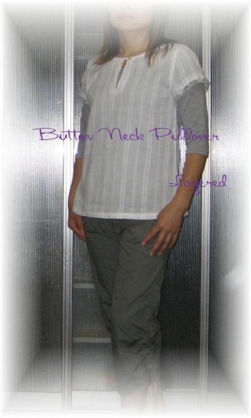 画像モデルは、バスト85cm身長156cmでSを着用しています。7分袖でつくる場合はMの方が着心地が良いと思いました。使用生地は「ローンドビーストライプ」透け感ありの素材でレイヤード用に作成しました。