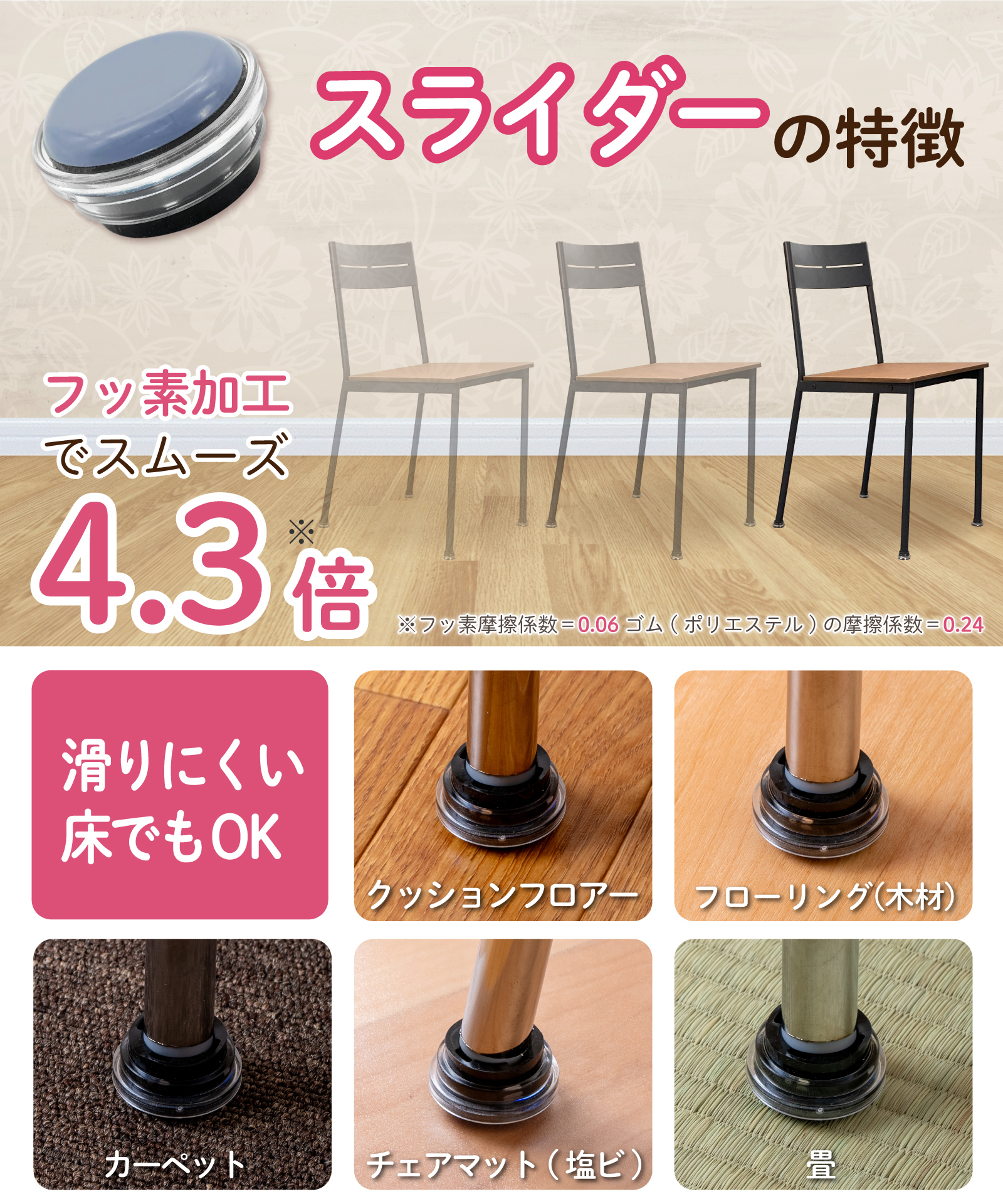 | 素 材 | (スライダー)フッ素フィルム貼付加工済ゴム、ポリカーボネイト (フェルト)羊毛フェルト、ポリカーボネイト | |||
