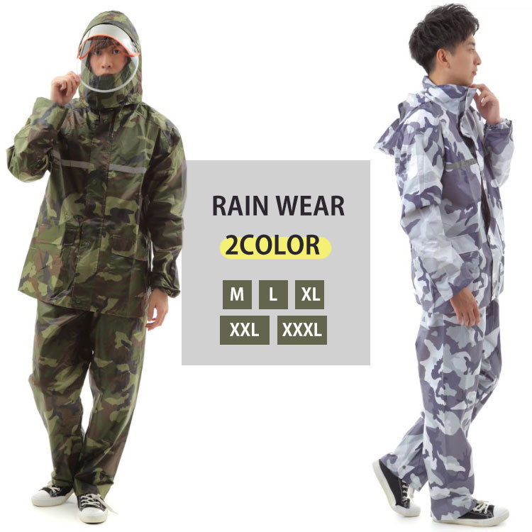 男女兼用の迷彩レインウェア上下。