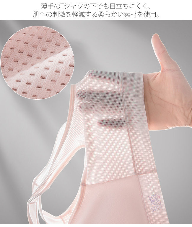 薄手のTシャツの下でも目立ちにくく、肌への刺激を軽減する柔らかい素材を使用。