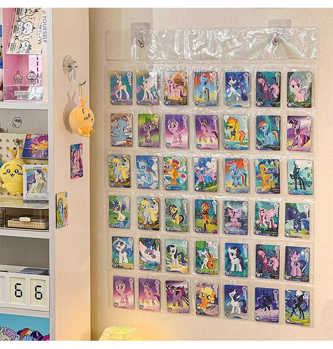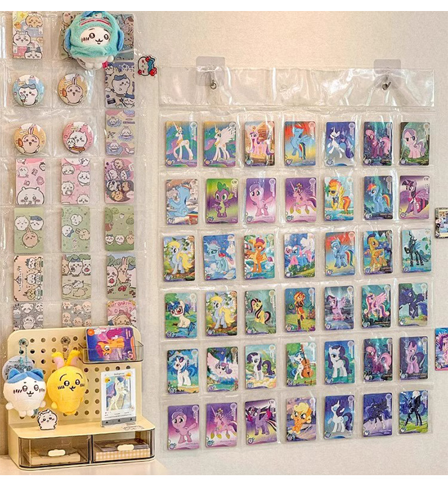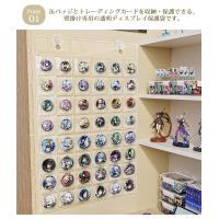 缶バッジとトレーディングカードを収納・保護できる、壁掛け専用の透明ディスプレイ保護袋です。