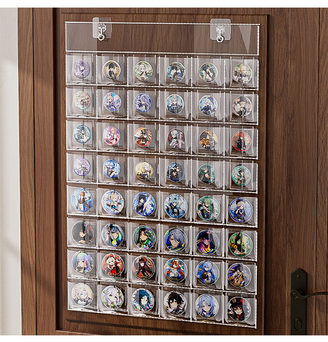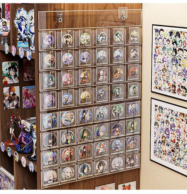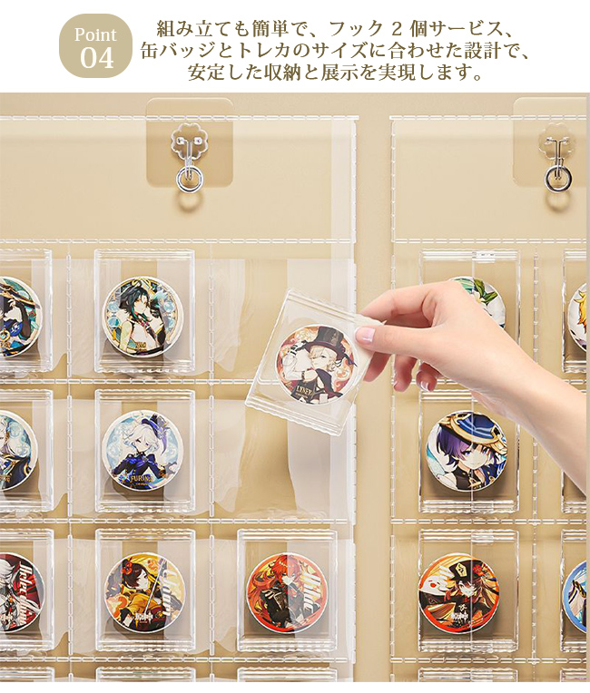 組み立ても簡単で、フック 2 個サービス、缶バッジとトレカのサイズに合わせた設計で、安定した収納と展示を実現します。