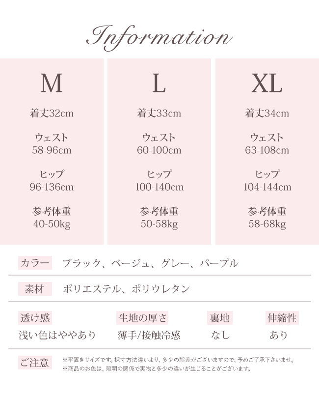 L:着丈33cm、ウェスト60-100cm、ヒップ100-140cm、参考体重50-58kg