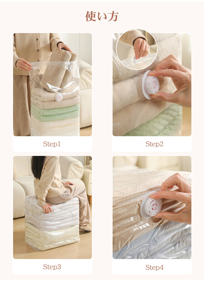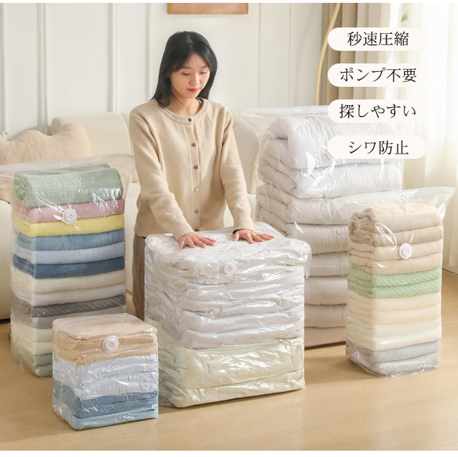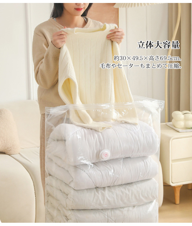 立体大容量:約30×49.5×高さ69.5cm、毛布やセーターもまとめて圧縮