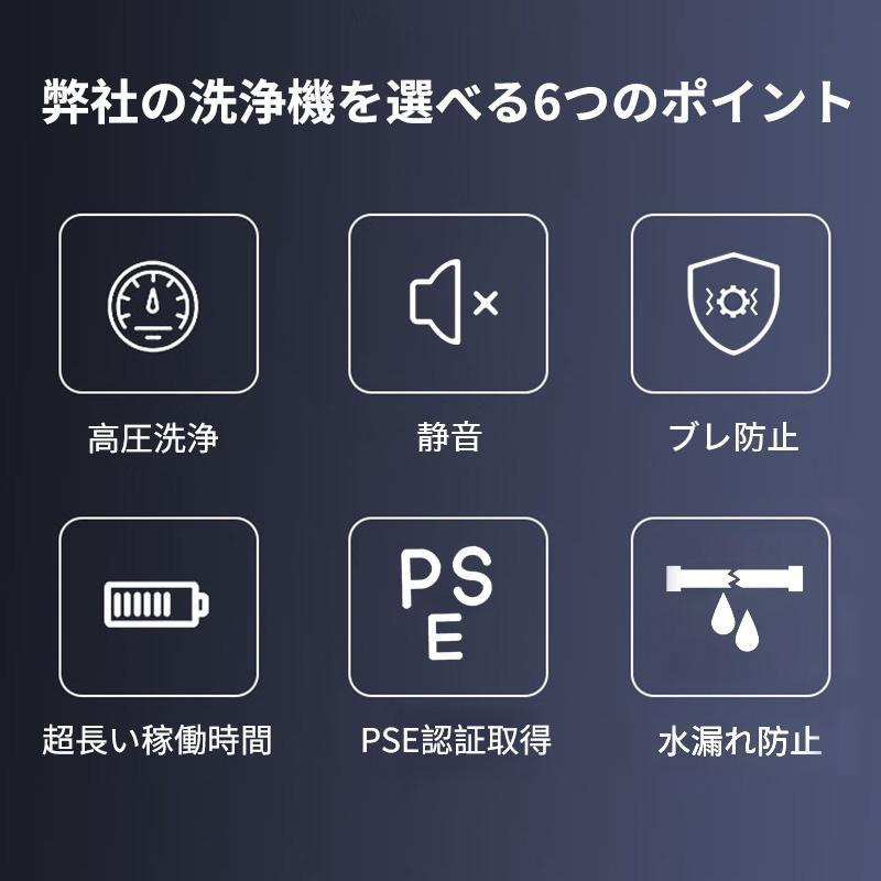 本機重量:1KG 吐出水量:5.2L/min 高圧ホース:5m 使用温度範囲:0〜50℃。豊かな付属品:洗浄ガン本体*1、給水ホース*1、バッテリー*1、充電器*1、クイックコネクタ*1、調節ノズル*1、自吸式フィルター*1、バブルポット*1、収納ケース*1 綱延長ロッド*1、日本語取り扱い説明書