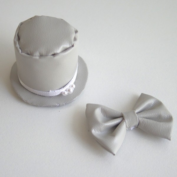 蝶ネクタイ&シルクハット完成品(レザー調ベージュグレー)サイズオーダー品 結婚式 ウェルカムドール用