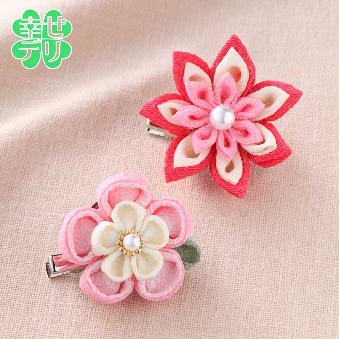 ちりめんで作る、つまみ細工の可愛いお花のブローチ手作りキットです。