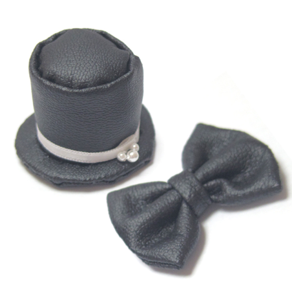 サイズオーダー品 蝶ネクタイ&シルクハット完成品(レザー調ブラック)結婚式のウェルカムドール・マスコット用