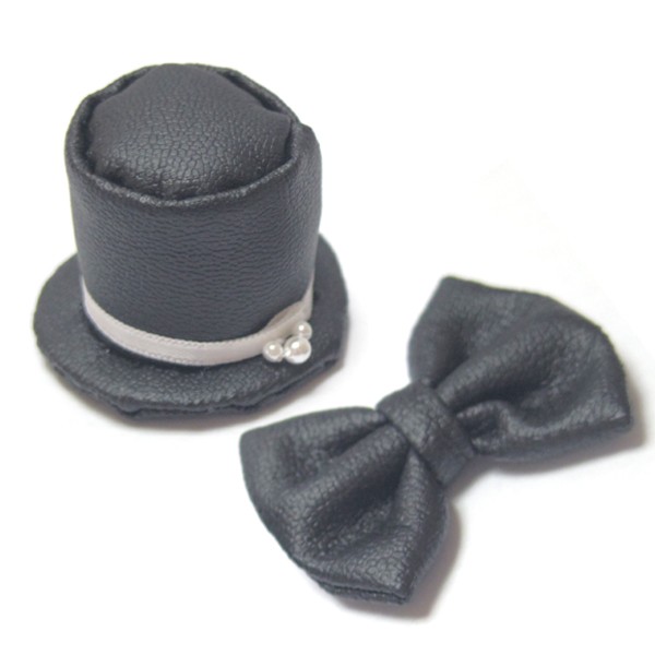 蝶ネクタイ&シルクハット完成品 規定Sサイズ (レザー調ブラック) ウェルカムドール ぬいぐるみ用