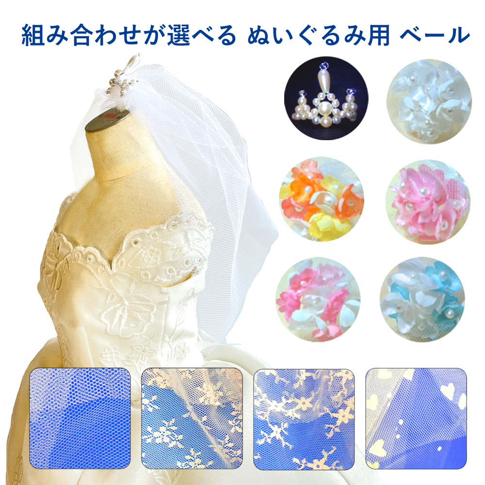 柄と飾りが選べる ぬいぐるみ用 ベール 完成品 レギュラーサイズ 全長約14cm ティアラまたはお花付き(ピン2本付) ヘッドの飾り付きヴェール