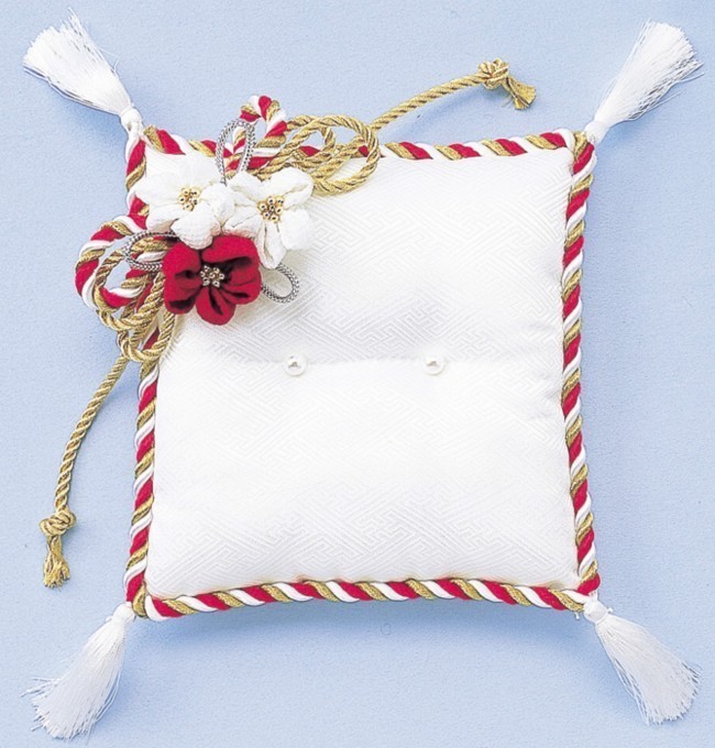 赤・金・白の紐でクッションを縁った、印象的なデザインのリングピロー。