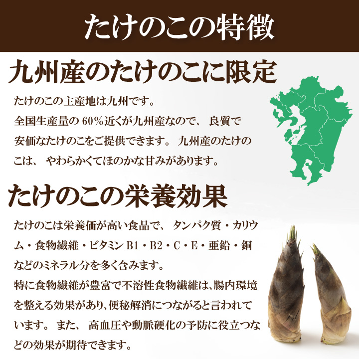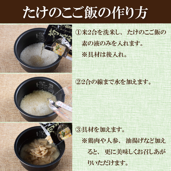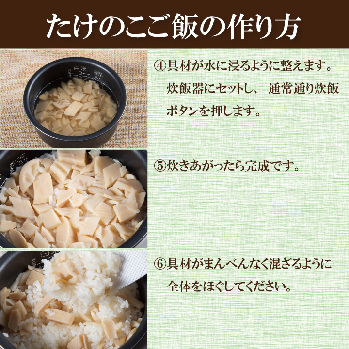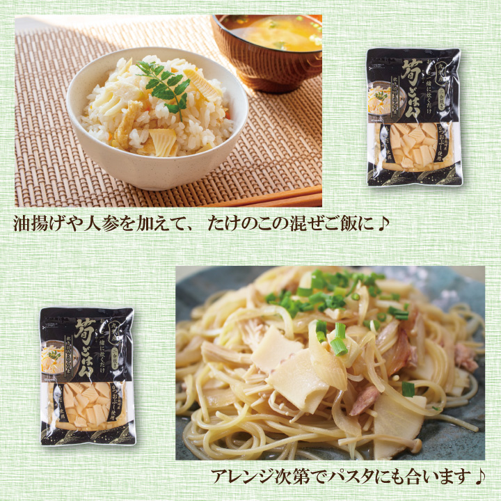 たけのこの主産地である九州産を使用した、筍ご飯の素。簡単調理で絶品のたけのこご飯をお楽しみください。