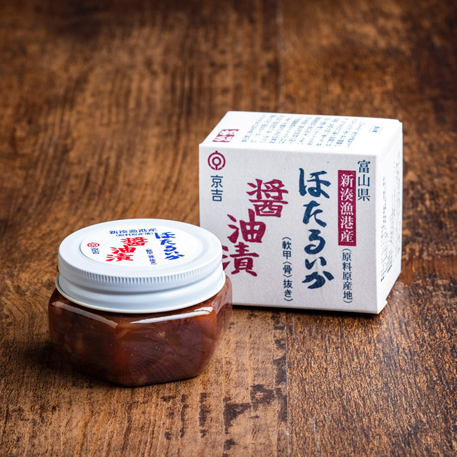 ほたるいかの醤油漬で富山の郷土料理、あつあつご飯ににのせて食べれば最高です。