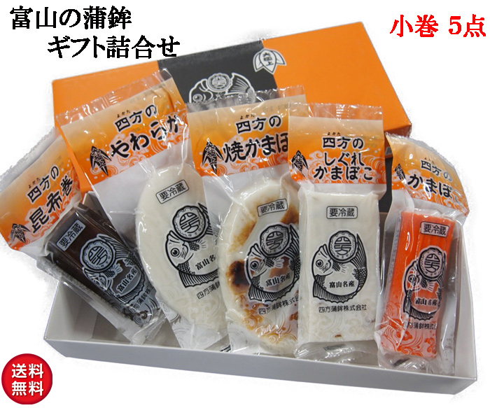 素材重視の高級志向、四方蒲鉾。社長がこだわり厳選されたスケソウダラを蒲鉾にしたギフトセット。【ギフトや手土産に最適】 お中元、お歳暮、通常のお祝い事から結婚式や結納、ギフトに最適なめでたい蒲鉾。頂いた方から大変喜ばれます。富山名産、老舗の四方蒲鉾。富山湾の四方漁港すぐそば。漁師町の蒲鉾屋として創業。素材と手作りにこだわった昔ながらの伝統製法。しっかりとした足があり、自慢の触感と味を堪能頂けます。足とは・・硬さの強弱、歯切れ、粘りの総称。【内容量】小巻5本セット 赤巻85g×1本、昆布巻85g×1本、白やわらか110g×1本、焼やわらか115g×1本、しぐれ115g×1本 外箱:29.5×13cm賞味期限は約1か月。クール便にて送料無料【おいしい食べ方】1、そのままよく冷やしお好みで醤油や一味やマヨネーズで頂けます。2、湯煎真空のまま熱湯で5分。まるで蒸したような触感です。3、焼きオーブンで少し焦げ目がつくまでやいてください。チャーハンの具としてもおいしいです。4、揚げそのまま天ぷらや、かき揚げの具としても最高です。5、煮鍋の具として煮ても大変おいしいです。いずれも、おやつや酒のつまみに最適です。