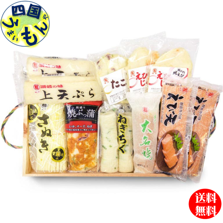 えび天×2 / 大名焼×1 / ねぎちく(2本入)×1 / 板盛り焼ぶっ蒲×1 / さぬきすまき×1 / 具だくさんたこ天×1 / えびじゃこ天×2 / 讃岐の味 上天ぷら×2